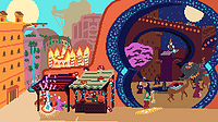 Across the marketplace, you see a beggar sitting motionless atop an elephant. The man is emanciated, looking more like a bunch of bones in a leather sack than a human. The elephant is sumptuously deco...