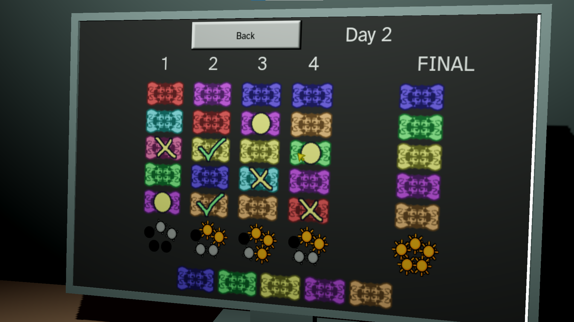 This was an interesting project to make. After reading an article contrasting the creative process of Bluey and Cocomelon. Cocomelon's Disctractotron is fundamentally horrifying, so much that I thought I should make a game around it. So, low-key office horror it is... but I was never able to make a game mechanic that supported the theme's weight. Two failed prototypes later, I pivot the game to a Cows and Bulls / Mastermind variant so I can get this out the door.